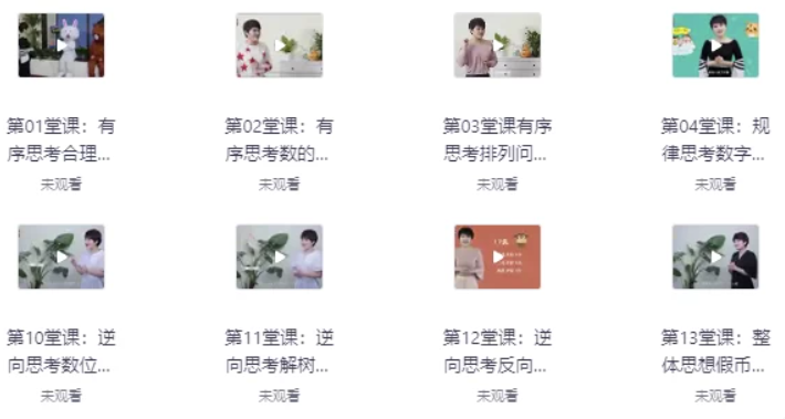 课程以生动有趣的动画视频和详细的音频讲解为主要教学形式,通过丰富多样的数学主题和充满趣味的故事情节,系统地培养学生的数学思维能力,包括有序思考、规律思考、正向思考、逆向思考、整体思想、分组思想、逻辑思考和发散思考等,旨在帮助学生建立扎实的数学思维基础,提升数学学习兴趣和解决问题的能力,同时引导家长掌握科学的教育方法,助力孩子全面发展。